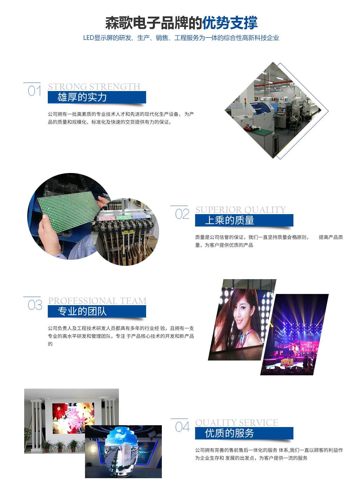 鄭州森歌電子科技有限公司是一家專業從事LED顯示屏的生產、銷售、工程服務為一體的高新科技企業。公司擁有一批高素質的專業技術人才和先進的現代化生產設備,公司的主要負責人及工程技術研發人員都具有15年以上的LED行業經驗,擁有一支專業的高水平研發和管理團隊,專注于LED核心技術的開發和LED新產品的自主創新,為產品的質量和規模化、標準化及快速的交貨提供有力的保證。公司在福建、深圳建立了生產基地。 鄭州森歌電子科技堅持以方案完善,質量過硬,服務及時為口號,堅持走高品質路線。現我公司工程業績已遍布省內外,并且在政府機構、軍事指揮、銀行系統、醫療教育、室內外廣告、酒店會所、公安指揮調度、水利工程、視頻會議等多個行業領域得到廣泛應用并獲得客戶的一致好評和普遍認可,是客戶值得信賴的長期戰略合作伙伴。